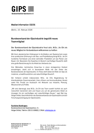 „Wir sind überzeugt, dass M.Sc. Jie Chi das Team sowohl fachlich als auch menschlich bereichern wird und freuen uns auf die gemeinsame Arbeit an Lösungen für ein nachhaltiges und zukunftsfähiges Bauen,“ sagt Dipl.-Ing. Holger Ortleb, Geschäftsführer des Bundesverbandes der Gipsindustrie und der Forschungsvereinigung der Gipsindustrie.