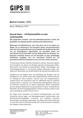 Mit diesen positiven baubiologischen und bauphysikalischen Eigenschaften sind Gipsbaustoffe eine wichtige Komponente für gesundes Bauen. Sie punkten darüber hinaus durch ihre Flexibilität im Einsatz. Trockenbaukonstruktionen ermöglichen eine von der Statik unabhängige, flexible Raumgestaltung, die sich individuell an die Bedürfnisse der Nutzer anpassen lässt. Installationen für Elektro- oder Sanitärtechnik verschwinden elegant im Wandhohlraum, während schlanke Wandkonstruktionen für zusätzlichen Platz – und damit auch für eine höhere Wirtschaftlichkeit bei Vermietungen - sorgen. Gleichzeitig erlauben Gipsplatten eine schnelle und saubere Bauweise ohne lange Trocknungszeiten – ein Vorteil, der die Bauzeit teilweise erheblich verkürzt. In ihrer Umfassendheit sind Gipsbaustoffe schwer zu substituieren. Dabei haben Alternativen durchaus ihre ökologischen Qualitäten und können den Trockenbau bei bestimmten Anwendungen sinnvoll ergänzen. „In den meisten Fällen jedoch bieten diese teilweise traditionellen Baustoffe weder bautechnisch noch ökonomisch oder ökologisch einen äquivalenten Ersatz“, sagt Holger Ortleb und ergänzt: „Sie unterscheiden sich vor allem in Bezug auf Verarbeitung, Verfügbarkeit, Kosten, Normung und Feuchteresistenz.“ Ortleb verweist darauf, dass viele Konstruktionen meist massiver ausgeführt werden müssen, um ähnliche Werte wie Gipsbaustoffe zu erreichen. Bestätigt wird dies auch durch eine wissenschaftliche Studie der TH Rosenheim und der VHT Darmstadt. Fazit: In einer Zeit, in der Schadstoffbelastungen zunehmend als Gesundheitsrisiko für Innenräume erkannt werden, bieten Gipsbaustoffe eine ideale Grundlage für gesunde, sichere und zukunftsfähige Lebensräume. Hergestellt auf der Basis des natürlichen, rein mineralischen Rohstoffs Gips verbinden sie gesundheitliche, bautechnische und ökologische Vorteile, sind praktisch emissionsfrei, regulieren das Raumklima, bieten hohen Brand- und Schallschutz und sind wirtschaftlich und umweltfreundlich.